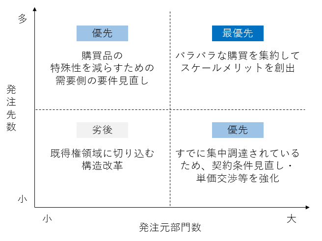 なお、削減ポテンシャル評価が難しい場合は、簡易的に「発注部門数の多寡×発注先サプライヤーの集中・分散度」の2軸で見ていくのも一手です。