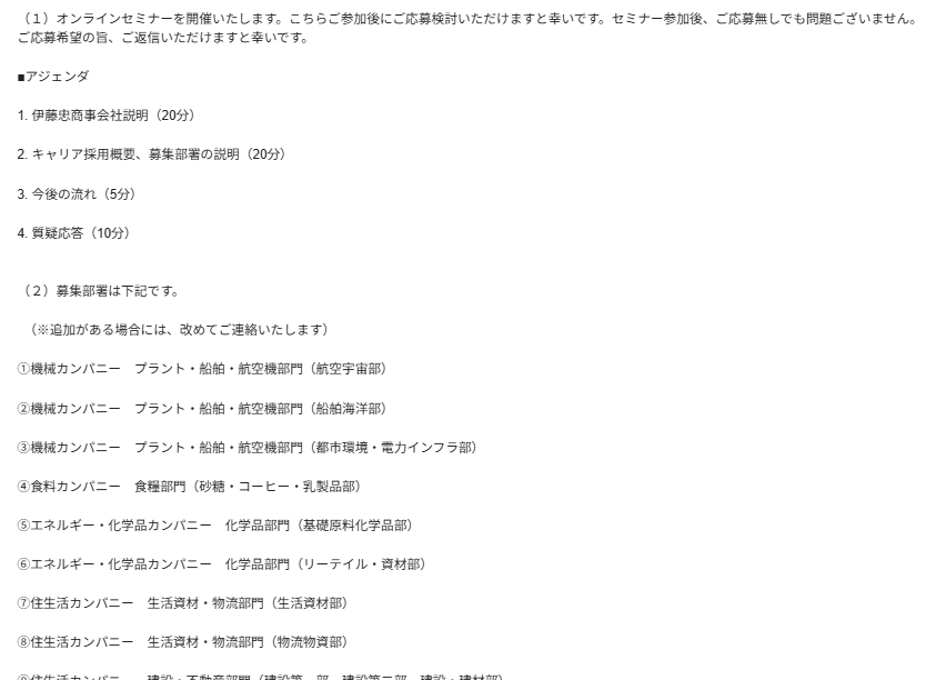 カンパニー・部門ごとの業務内容や、求める人材要件の全体像を確認できる貴重な機会となります。