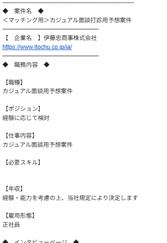そこに登録しておけば、自分の経歴にマッチする部署の求人が出てきた場合に伊藤忠からダイレクトスカウトを受けることができるようになっています。