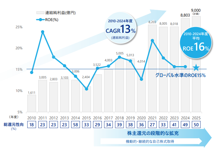 伊藤忠は2010年からCAGR: 13%で成長しており、直近数年は8000億円超という驚異的な水準で安定しつつあります。