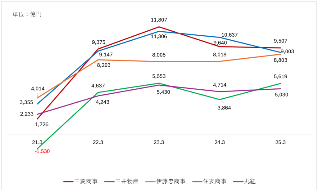 直近5年でみると、伊藤忠は安定的にTOP3のポジショニングを維持しています。