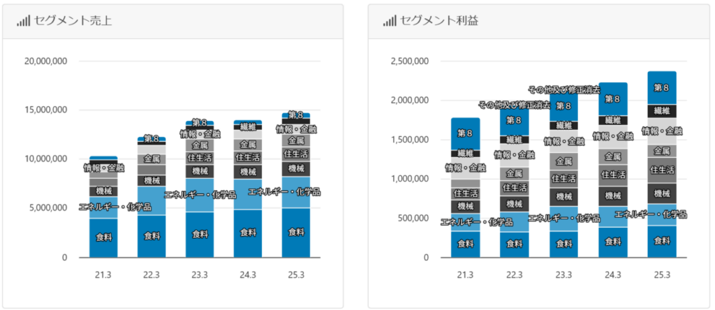 一方で、利益ベースでみると上記セグメントの貢献は薄まり、情報・金融、第8 (ファミマ事業等)のセグメント利益が大きくなっており、全体としても非常にバランスの取れたポートフォリオに仕上がっています。