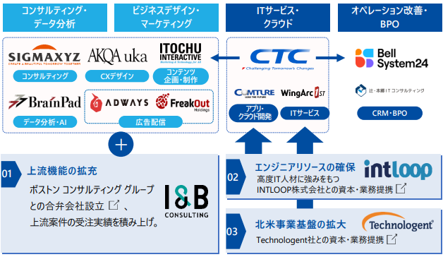 2023年にはSIerである伊藤忠テクノソリューションズ(CTC)を3800億円の巨額投資で完全子会社化したほか、2024年には高度ITフリーランス人材活用に強みを持つINTLOOPとの資本提携、BCGとの合弁会社設立などの具体的な動きを取っています。