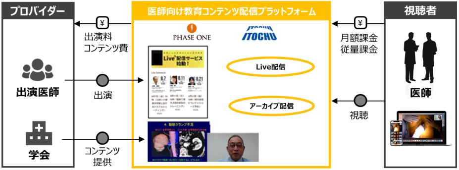 また、医師向けには、医療マーケティング事業を展開するフェーズワンと提携し、ベテラン医師による医師向け教育コンテンツのライブ配信やアーカイブ配信を行うサービスを展開しています。